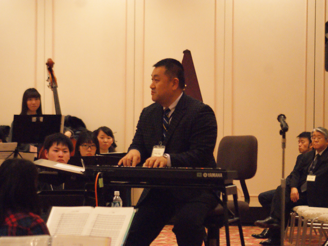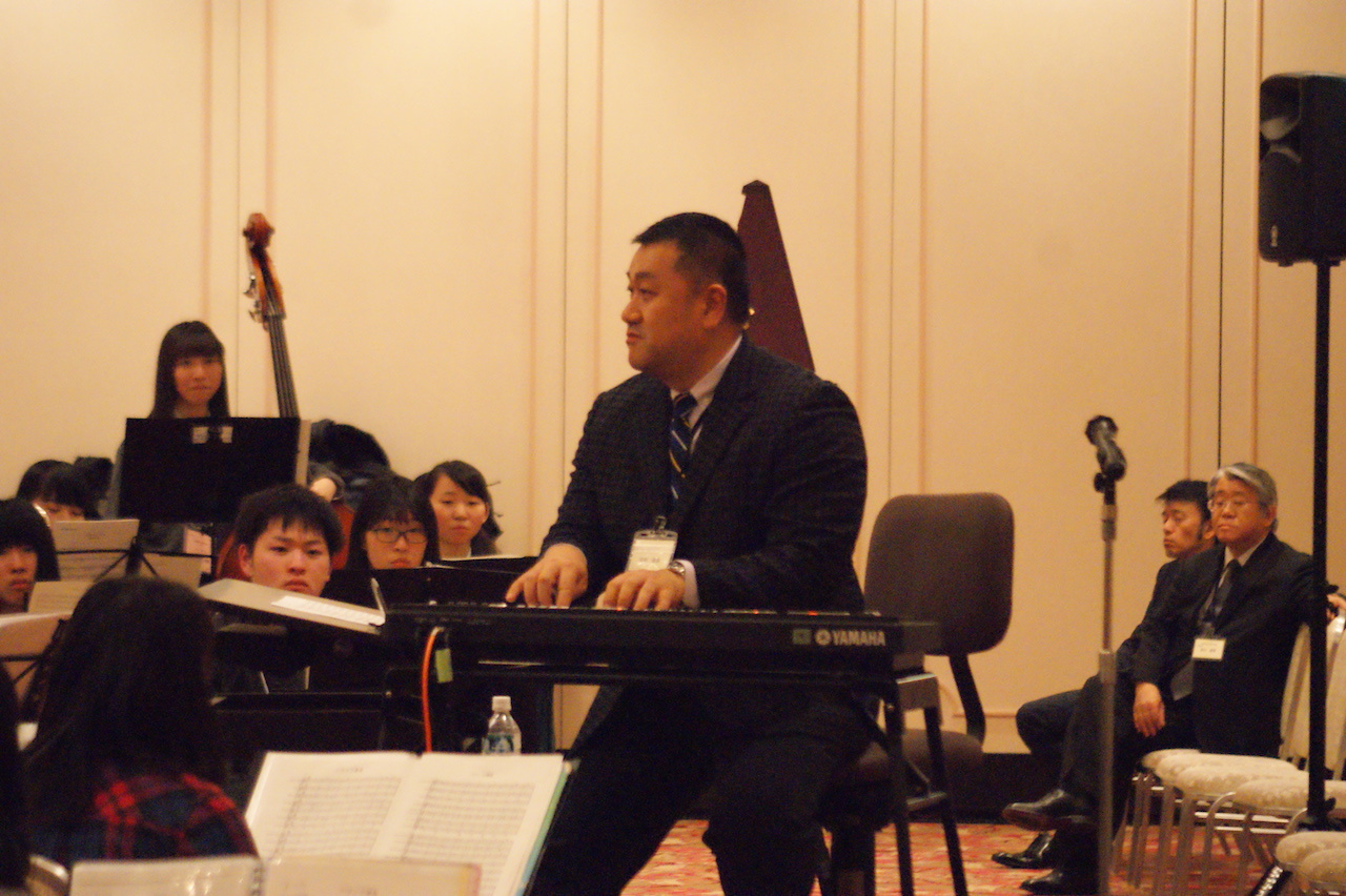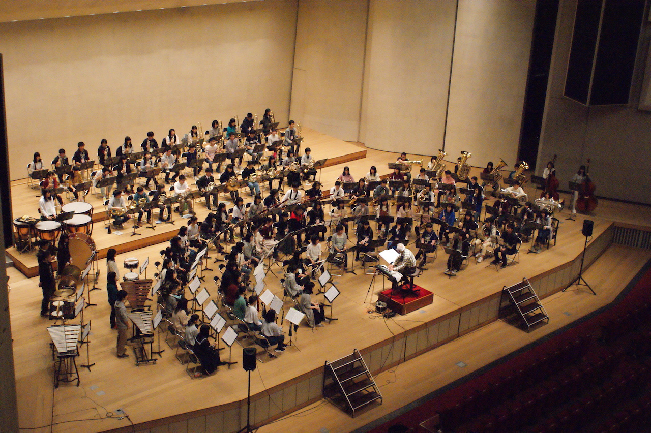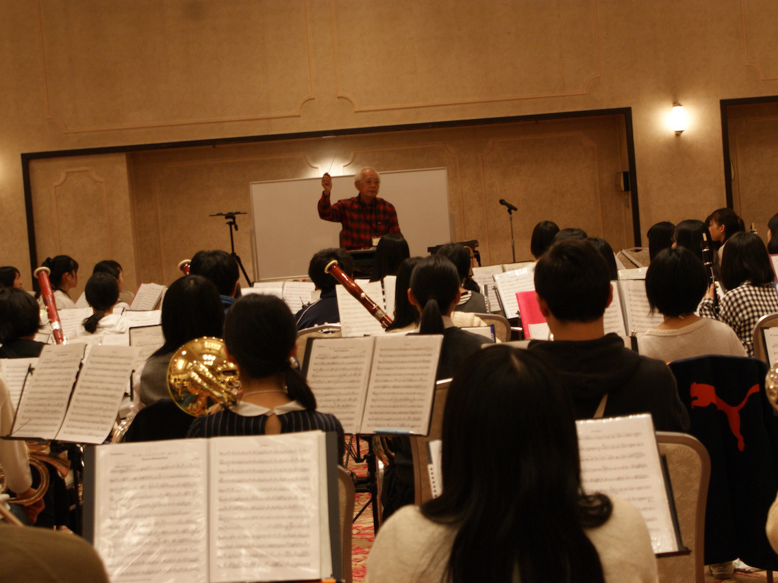 そして、この日の夜は、保科先生の指導の下、受講生全員による合同バンドを対象にした合奏講座パートⅡです。題材には今年度の吹奏楽コンクール課題曲ⅡとⅢが選ばれました。作曲家としての楽曲分析と見事なバトンテクニックで受講生を導き、知らず知らずに引き上げられていく自分たちに、受講生は驚きを隠せない様子でした。とくに、課題曲Ⅲは保科先生自身による作品の「インテルメッツォ」。作曲者本人による演奏指導ということで、会場全体、独特の緊張感の中で始まりましたが、練習の冒頭で保科先生の「自分の曲やるのって嫌なんだよね。だって、何だか照れ臭くて…」とまさに照れ笑いしながらのことばによって、やわらかい緊張感の中で講習が進行しました。細かい講習内容についてはこの紙面ではお伝えしきれませんが、受講生はもちろん聴講されていた連盟加盟団体の先生方やわれわれスタッフにとっても贅沢で貴重な講習であったことはいうまでもありません。