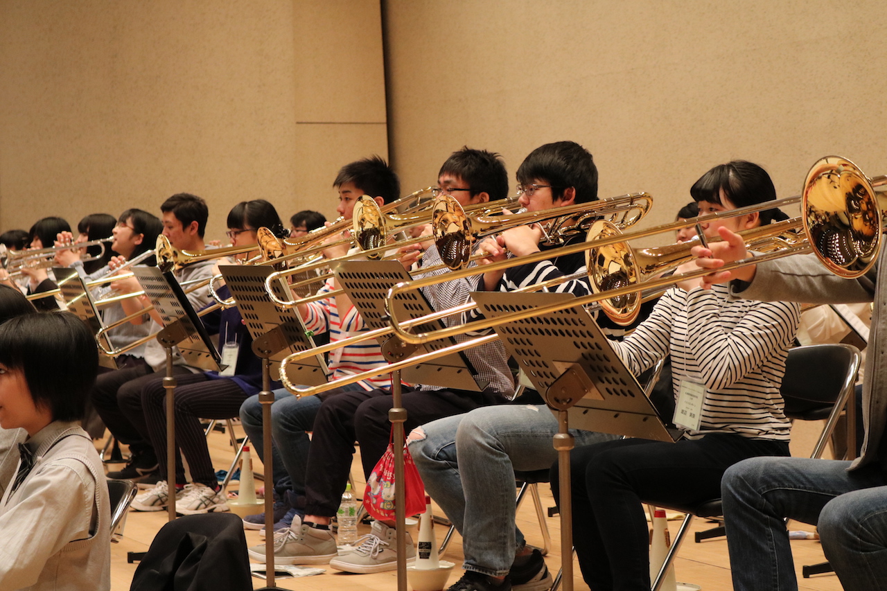5回目となった今回は、初日と2日目は「合奏講習」を主として行い、メインディレクターに保科洋氏(作曲家)、中村俊哉氏(バンドディレクター)、そして当連盟理事長の井田重芳氏も担当しました。2日目夜に「コンサート&研究発表」と題し、クラリネット奏者の中川知美氏(フリー)、サクソフォーン奏者の國末貞仁氏(洗足学園音楽大学講師)の独奏(いずれもピアノ伴奏は中谷友美氏)、そして札響金管五重奏団(Tp.福田善亮氏、Tp,佐藤誠氏、Hr,岩佐朋彦氏、Tb.山下友輔氏、Tub.玉木亮一氏)の皆さんによるコンサート、受講生合同バンド(指揮と解説は保科洋氏)による、2017年度吹奏楽コンクール課題曲のⅡとⅢの研究発表を行いました。最終日となる3日目は、札幌交響楽団他のプロ奏者による「各楽器別の実技講習会」を実施いたしました。