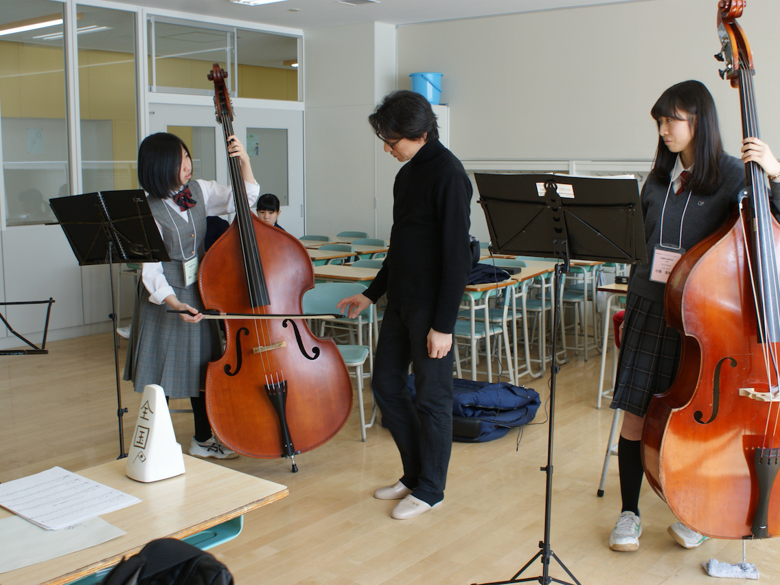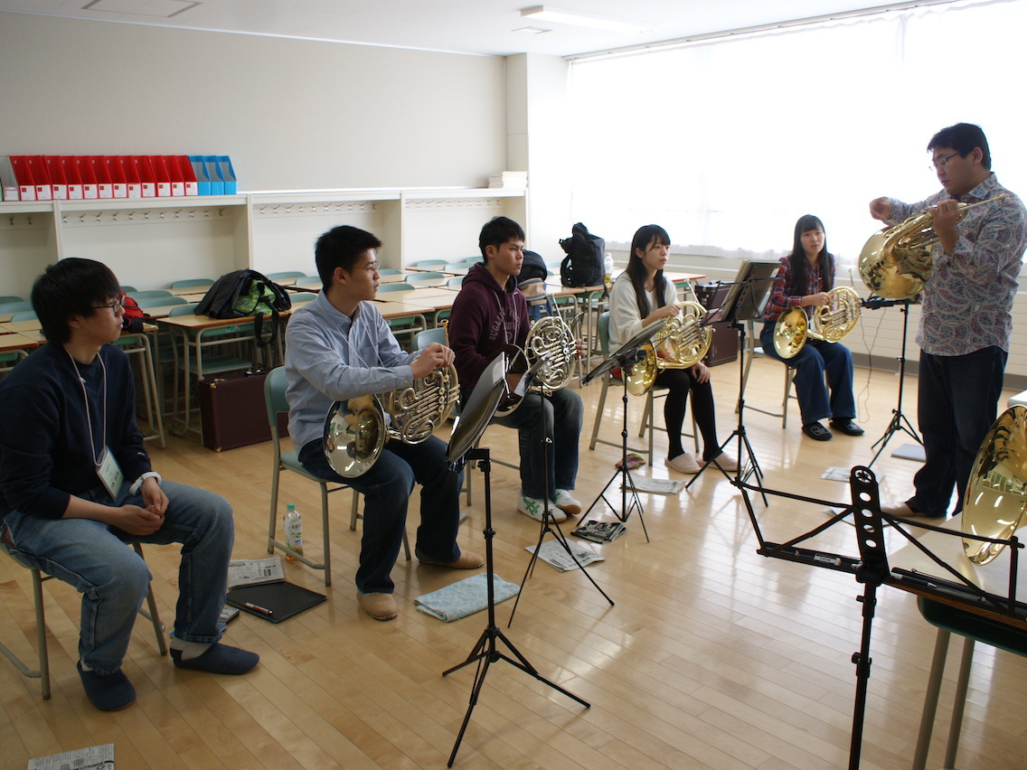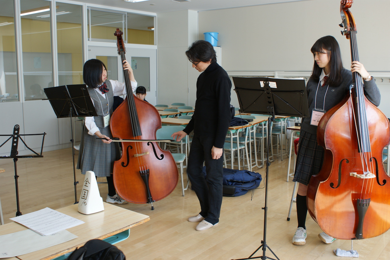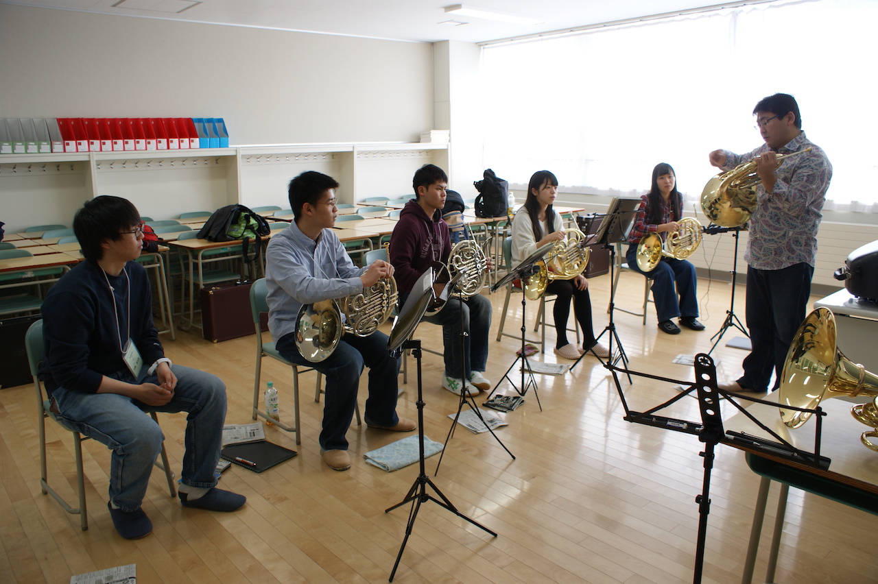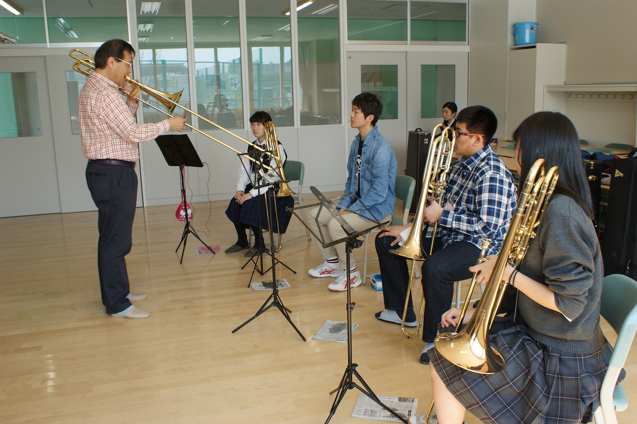 最終日となる3日目は、会場を札幌市立啓明中学校に移し、楽器別の実技講習会を行いました。この講座の講師には札幌交響楽団員をはじめ、前日に素晴らしい演奏を披露してくださった、サクソフォーン奏者の國末貞仁氏、ユーフォニアム奏者の大山智氏、打楽器は昭和音楽大学教授の石内聡明氏など、豪華な講師陣で実施することができました。専門家から指導を受ける機会が少ない受講生にとっては、最終日の疲れも見せず生き生きと受講しておりました。