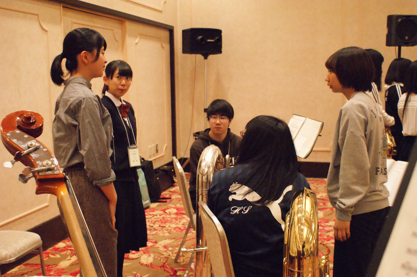 続く、2日目は午前中に講座パートⅢとなる「基礎合奏講座」。午後からは中村先生による「楽曲指導講座」。楽曲を演奏するために必要となる基本的な演奏方法の要素を基礎合奏講座の内容と関連させた講習となりました。そして、この講座の後半では新しい試みとして「部活動運営についての情報交換会」を行いました。井田先生にコーディネーターとして進行役を務めていただき、普段の活動する中でのそれぞれの学校での問題点や悩みを発表し、それに対する他の学校での実践や解決方法を発表してもらい、最後にコメンテーターとして保科、中村両先生からアドバイスをいただくという形式で行われました。受講生アンケートには「他の学校でも自分たちと同じような悩みを持っているんだな…」「先生方のアドバイスは新鮮で今後の活動の活力になった」。指導者アンケートからも「2日目の夕方の情報交換は、ある意味で、受講生徒が望んでいた内容かと感じました。活動の中で、不安に感じていることも限られた時間ではありましたが共有できたように思います。生徒間の炉辺談話や情報交換も交流の一環としてはよいのですが、今回のようにコメンテーターやコーディネーターを、講師として進めた方がより良い解決がみられるのでは」とあるように演奏技術だけではない部活動運営に関しても情報交換でき、受講生にとっても指導者にとっても大変有意義な時間になったのではないでしょうか。