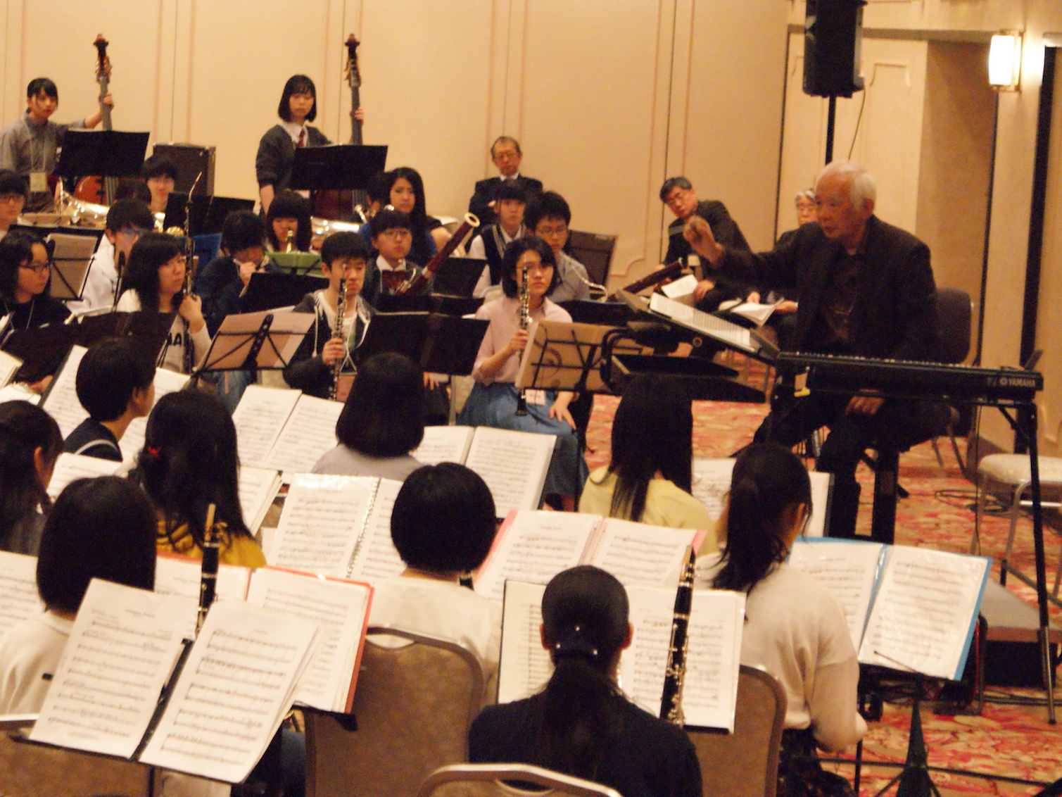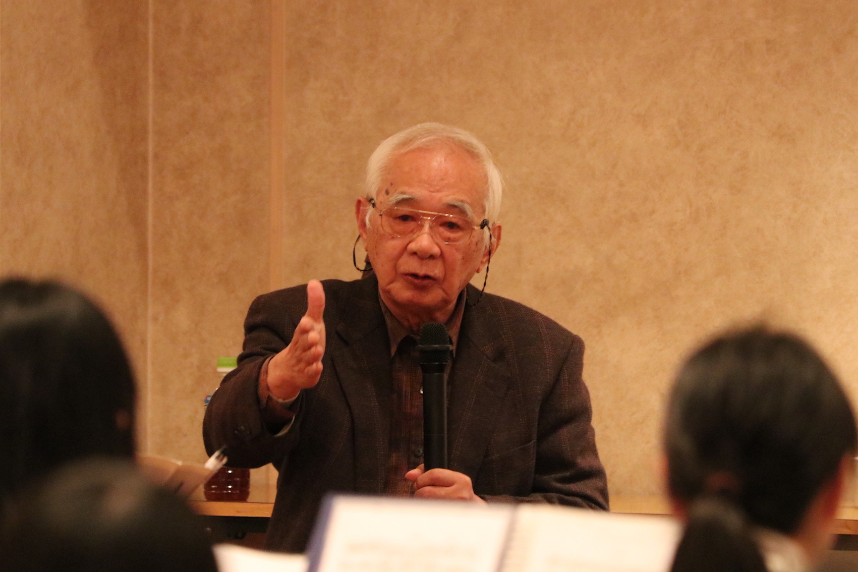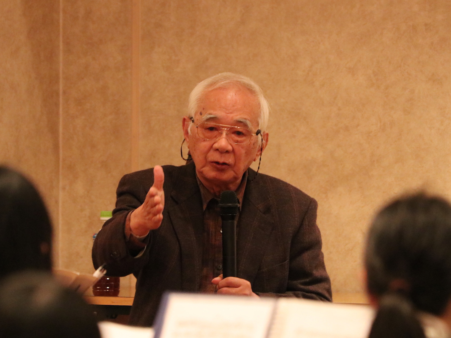 そして、この日の夜、講座パートⅡ「楽曲指導講座」では、いよいよ保科先生の登場です。保科先生には4年連続でこの講義を担当していただいております。昨年のこのキャンプのあとに体調を崩され、我々としても大変心配していた中でのお願いでしたが、全くそれを感じさせないいつもと変わらない、いやいつも以上に熱い思いで高校生たちに講義していただく姿に我々もほっとすると同時に、この場では言い尽くせない感謝の気持ちを持たずにはいられません。保科先生の講義内容で毎年感じさせられるのは、技術的な音楽表現のセオリーはもちろんのこと、音楽作品に対するリスペクトの大切さです。そして、それはアマチュアであり、技術的にまだまだ未熟な高校生を相手にしても、またプロのリハーサルであってもその求める内容は全く変わらないということです。