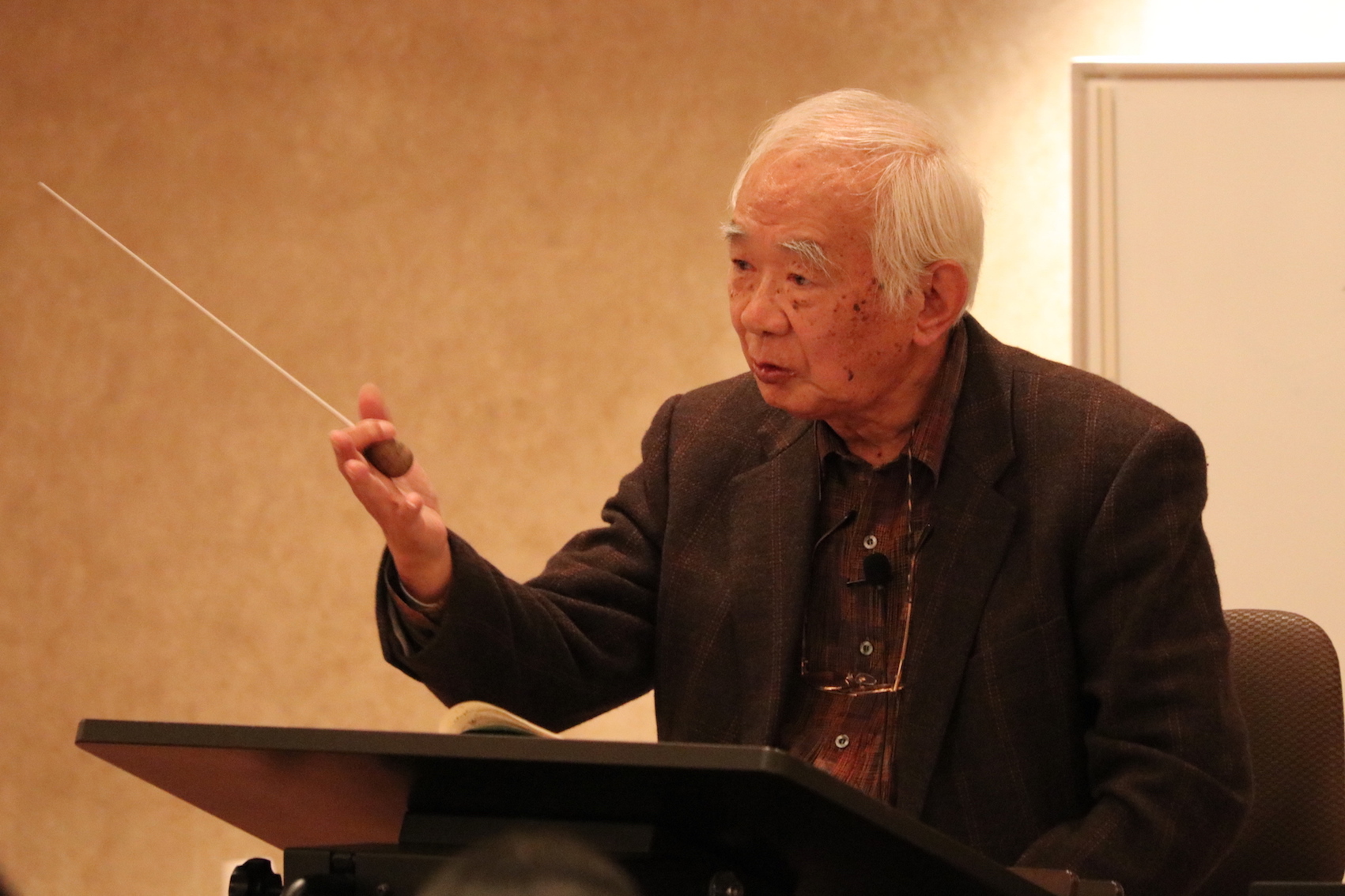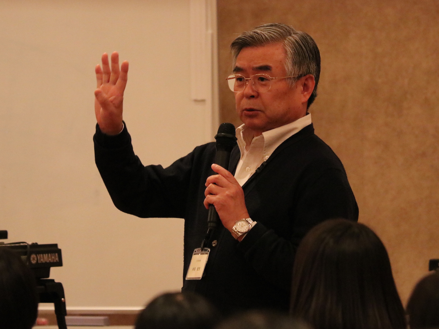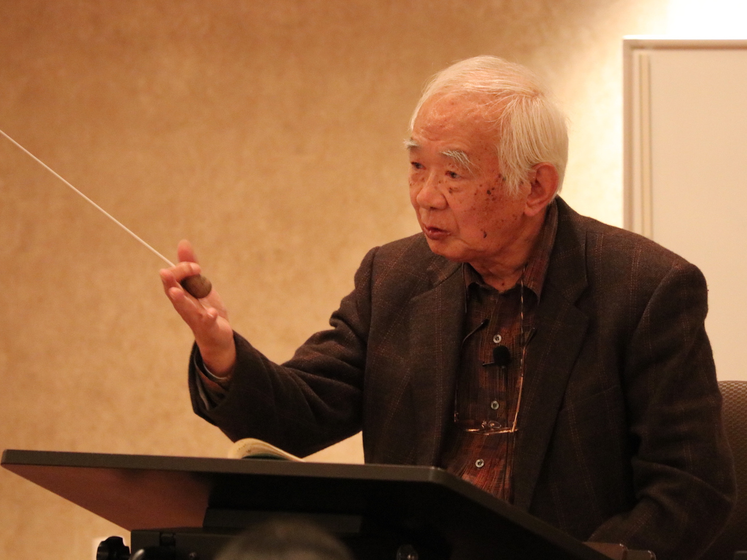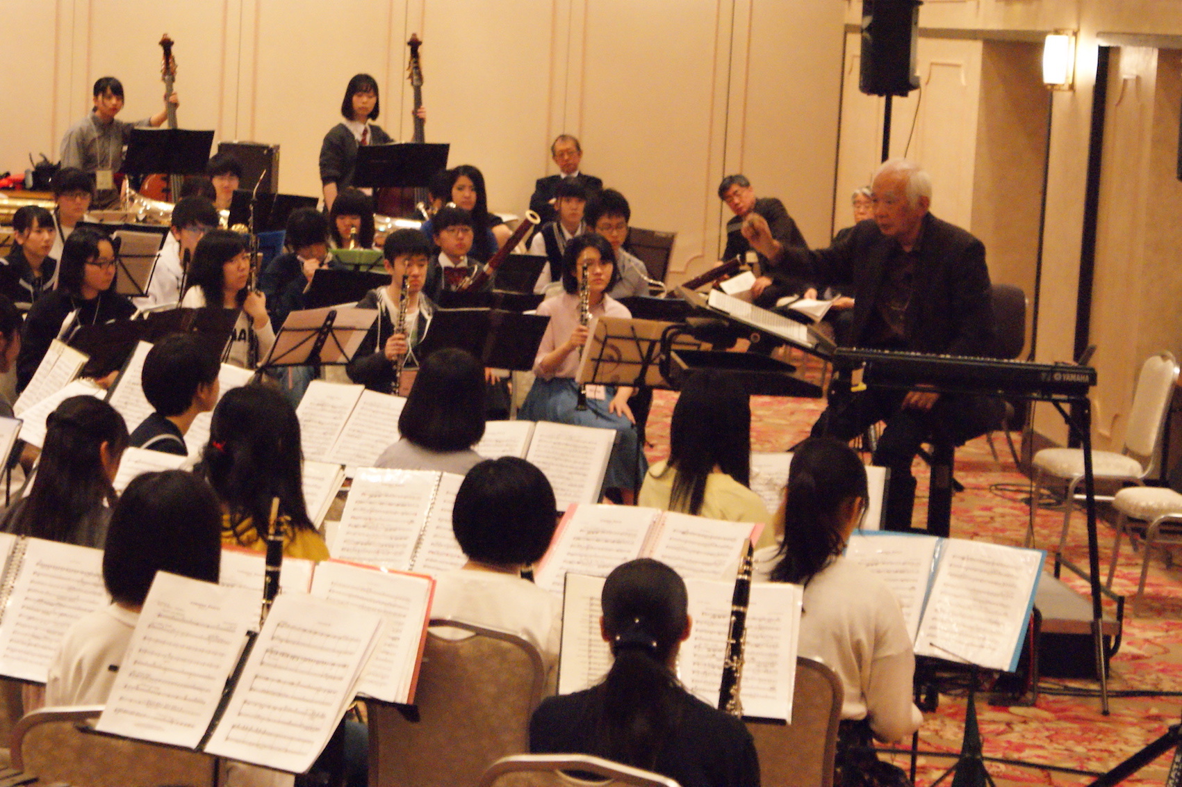 そして、この日の夜、講座パートⅡ「楽曲指導講座」では、いよいよ保科先生の登場です。保科先生には4年連続でこの講義を担当していただいております。昨年のこのキャンプのあとに体調を崩され、我々としても大変心配していた中でのお願いでしたが、全くそれを感じさせないいつもと変わらない、いやいつも以上に熱い思いで高校生たちに講義していただく姿に我々もほっとすると同時に、この場では言い尽くせない感謝の気持ちを持たずにはいられません。保科先生の講義内容で毎年感じさせられるのは、技術的な音楽表現のセオリーはもちろんのこと、音楽作品に対するリスペクトの大切さです。そして、それはアマチュアであり、技術的にまだまだ未熟な高校生を相手にしても、またプロのリハーサルであってもその求める内容は全く変わらないということです。