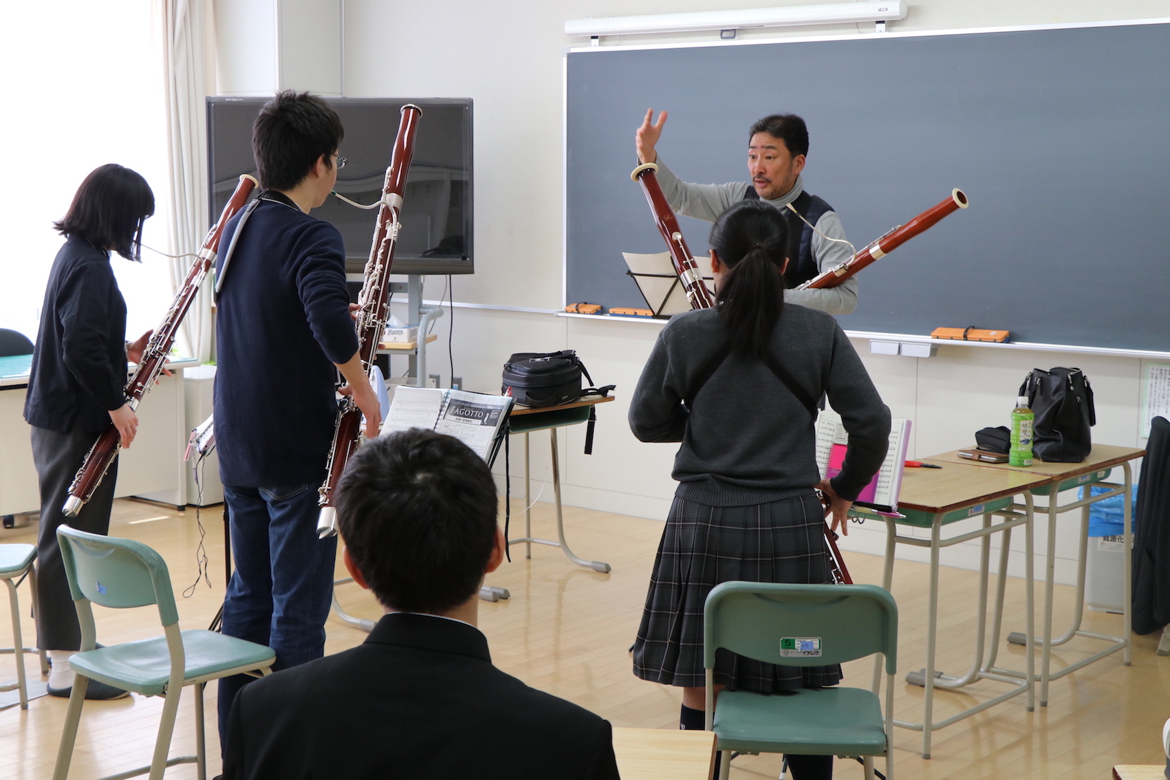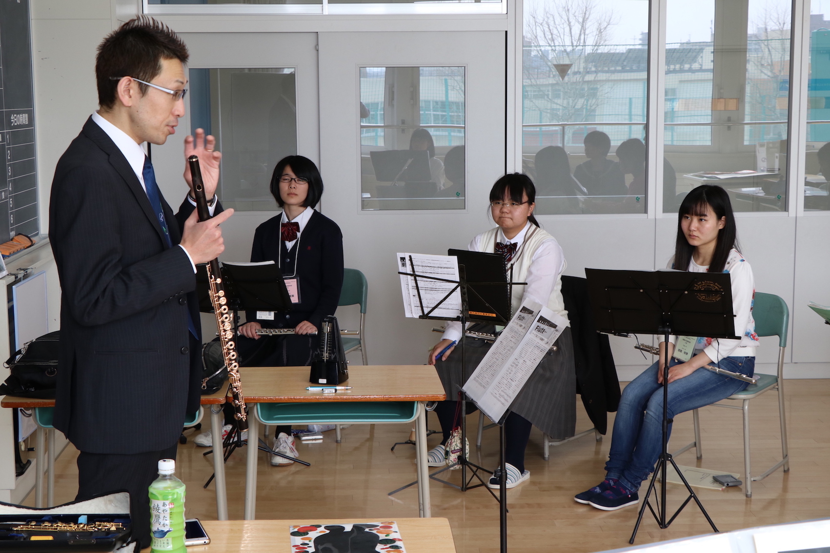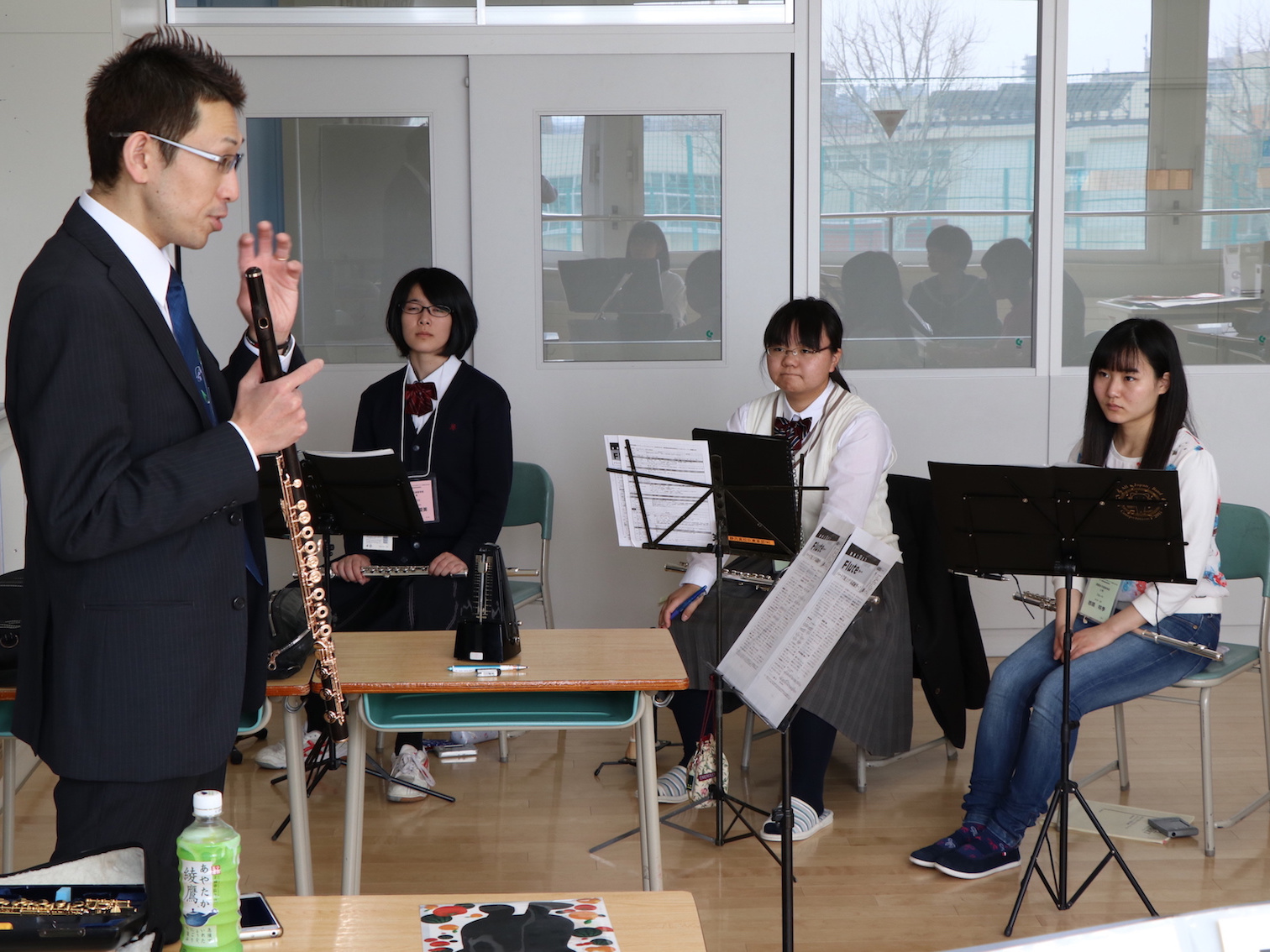 最終日となる3日目は、会場を札幌市立啓明中学校に移し、楽器別の実技講習会を行いました。この講座の講師には札幌交響楽団員をはじめ、東京佼成ウインドオーケストラのフルート奏者の丸田悠太氏、サクソフォーン奏者の中村均一氏、ユーフォニアム奏者の牛渡克之氏、東京フィルハーモニー管弦楽団の打楽器奏者である船迫優子氏などを加え、豪華な講師陣で実施することができました。専門家から指導を受ける機会が少ない受講生にとっては、最終日の疲れも見せず生き生きと受講しておりました。