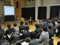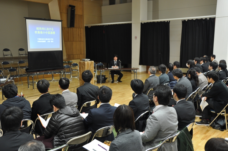 午前中の講習では「吹奏楽部の運営について」と題して、酒井根中学校の運営方法や練習方法の実践内容をご紹介いただきました。限られた練習時間の中で、平日の朝に毎日行われている基礎合奏やチェック表を利用したスケール練習などの個人練習の指導方法についての紹介は受講者にとって、今後の指導において参考になるものが大変多かったのではないでしょうか。また、柏市内における吹奏楽小中高校連携についてもご紹介いただきました。